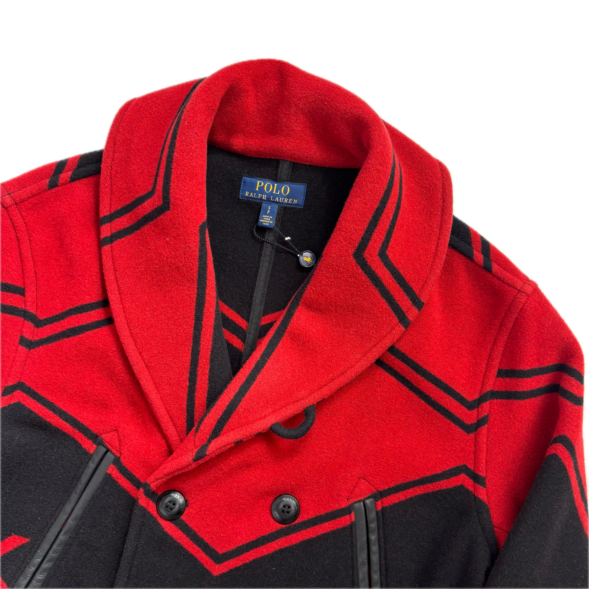 Polo Ralph Lauren Black Red Double Breasted Aztec Pea Coat (Wool Blend) - S